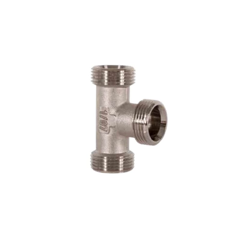 Euroconus T-stuk 3/4″ buitendraad, uitgevoerd met drie aansluitingen (3 × 3/4″ buitendraad euroconus). Ideaal voor het koppelen en vertakken van verwarmings- en leidingsystemen.