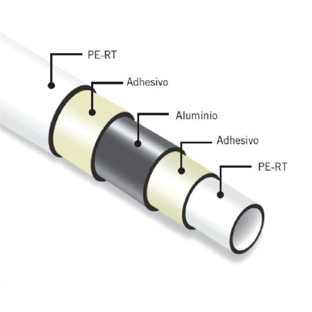 Vijflaagse PERT-AL-PERT buis met aluminium zuurstofbarrière. Geschikt voor vloerverwarming, koeling en distributie van warm en koud water.