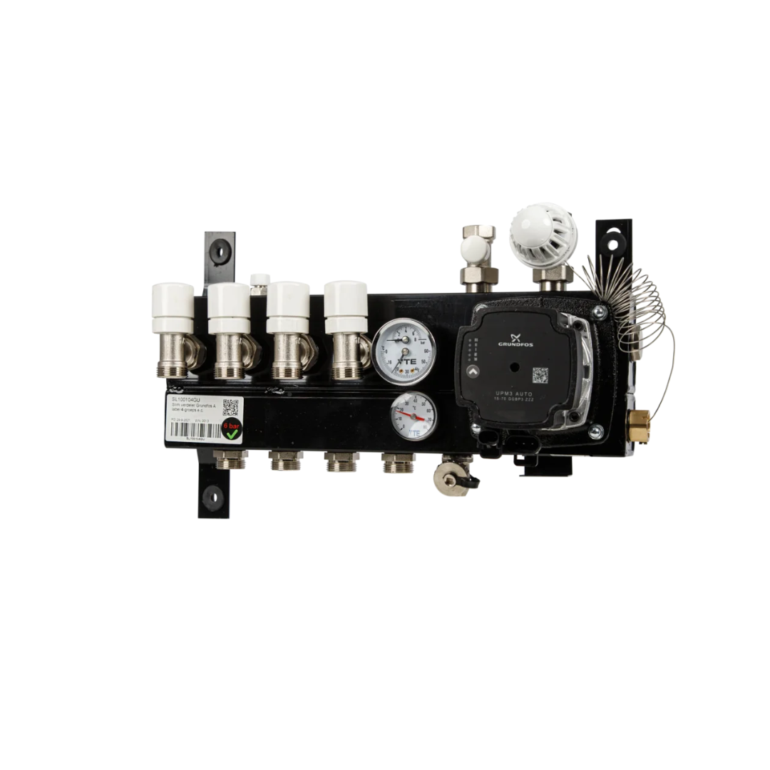 De stalen Compact-verdeler is een complete vloerverwarmingsverdeler, uitgevoerd met een Grundfos UPM3 circulatiepomp. Deze unit is ontworpen voor zowel hoofd- als bijverwarming en is geschikt voor hoge- en lage temperatuurverwarming. Dankzij de compacte bouw en de geïntegreerde pomp wordt een optimale warmteverdeling gerealiseerd, met een stille werking en hoge energie-efficiëntie.